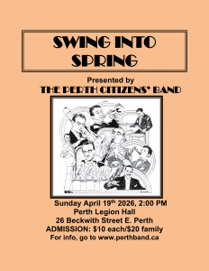 The Perth Citizens’ Band, Canada’s oldest continuing town band, is preparing for the 2026 season of its annual Summer/Fall Pops Concert Series. These concerts in the downtown core have been a longstanding tradition of the band for well over 100 years. The concerts feature a variety of music ranging from classical, Broadway and movie themes, to jazz, rock, blues and other popular forms; a bit of music for all tastes and ages. In addition, conductor Brian Tackaberry includes heritage pieces from the band’s historic files as well as songs by Canadian composers or arrangers.